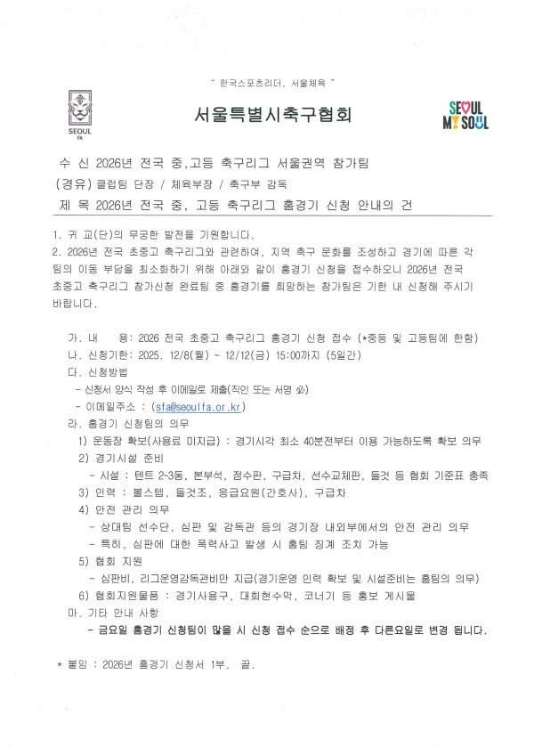 - 2026년 전국 중,고등 축구리그 홈경기 신청 안내의 건공문.pdf (405.0K) 9회 다운로드 | DATE : 2025-12-05 18:14:29
