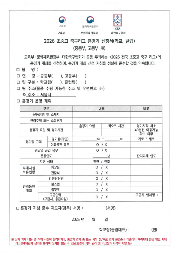 2026년 전국 중, 고등 축구리그 홈경기 신청 안내