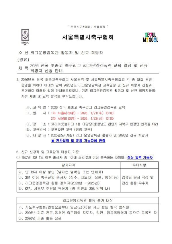 2026 전국 초중고 축구리그 리그운영감독관 교육 일정 및 신규 희망자 신청 안내