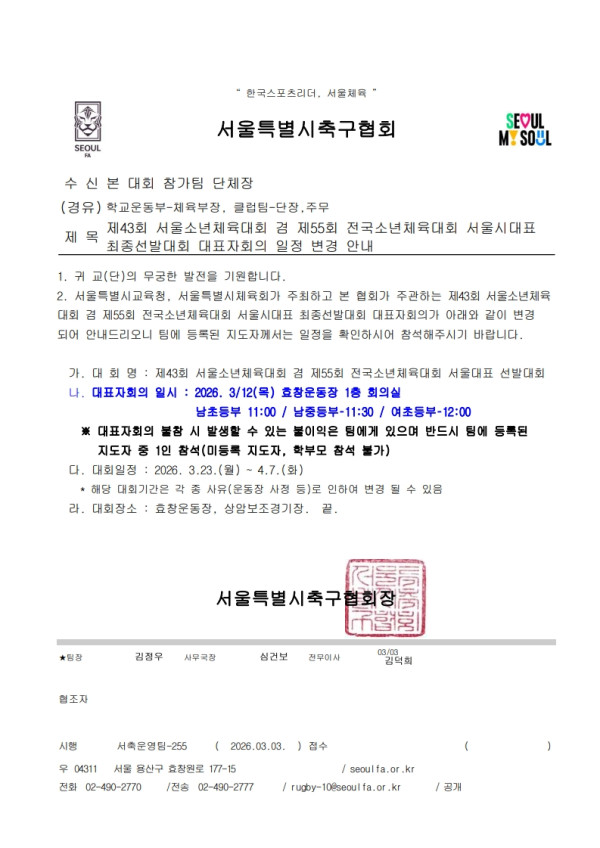 - 제43회 서울소년체육대회 겸 제55회 전국소년체육대회 서울시대표 최종선발대회 대표자회의 일정 변경 안내.pdf (57.4K) 77회 다운로드 | DATE : 2026-03-03 16:50:34