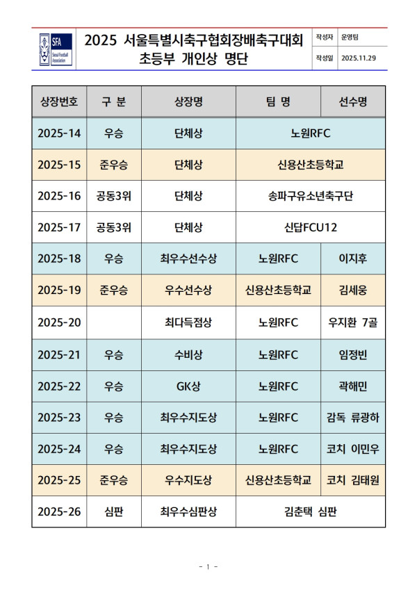 2025 서울특별시축구협회장배 축구대회[초등부](우승-노원RFC / 준우승-신용산초)