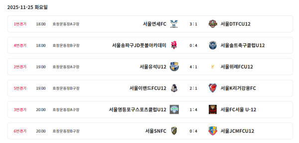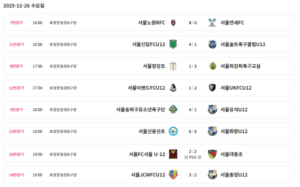 클럽팀 : 노원RFC, 연세FC, DTFCU12, 최강희축구교실, 송파구유소년축구단, 유석U12, 위례FCU12, 영등포구스포츠클럽U12, FC서울 U-12, 신답FCU12, 송파구JD풋볼아카데미,